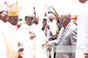 Bishop Samuel Nkuah-Boateng took canonical possession of the Catholic Diocese of Wiawso on April 21, 2023. His installation ceremony was a significant event in the Diocese, attended by Traditional Authorities, Members of Parliament, and Municipal and District Chief Executives from the Western North Region. The ceremony was led by His Eminence Peter Cardinal Appiah Turkson and Most Rev. Henryk Mieczyslaw Jagodzinski, the Apostolic Nuncio to Ghana, and was attended by the former President Nana Addo Dankwa Akufo-Addo.