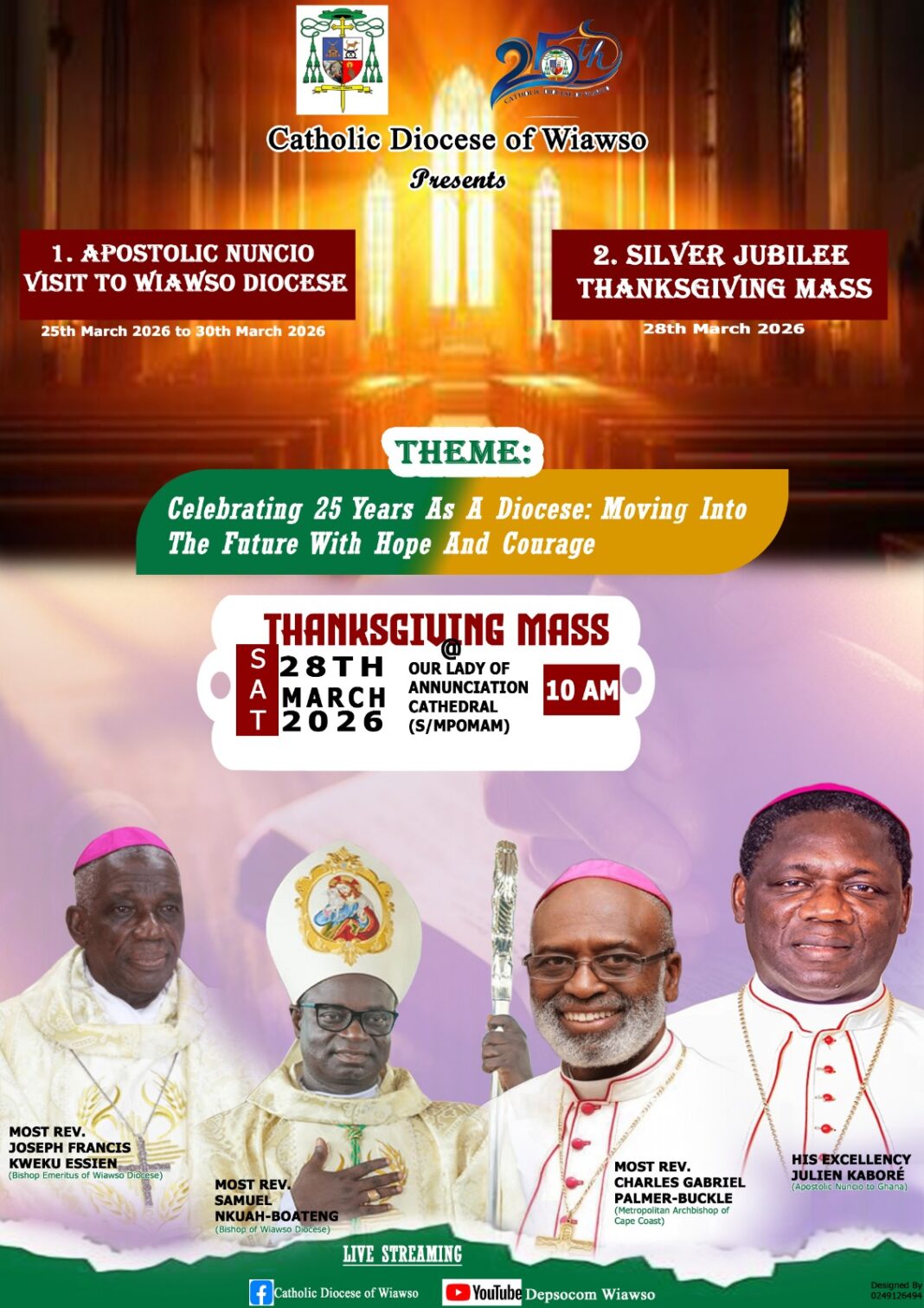 In attendance to mark the Silver Jubilee on the theme: “Celebrating 25 Years as a Diocese: Moving into the Future with Hope and Courage,” will be the Bishop Emeritus of Wiawso, the Most Rev. Joseph Francis Kweku Essie; the Most Rev. Charles Gabriel Palmer-Buckle, Metropolitan Archbishop of Cape Coast, Honourable Wilbert Petty Brentum-Western North Regional Minister, Nana Ofori Ahenkan II, the Regent of Wiawso Traditional Council and Chief of Sefwi Boinzan, and many distinguished personalities.