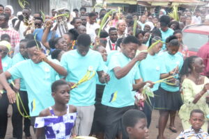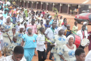 Before the Mass, the Nuncio was accompanied by Bishop Nkuah-Boateng and the faithful for the Palm Sunday procession through Wiawso town despite the rain. With a brass band, the faithful, both old and young, danced, raising their palm fronds, singing “Hosanna.”