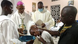 Present at the Easter Vigil Mass were: Mr. Lazarus Nyuurbome and Mrs. Diana Terkemuureh, a couple from Holy Trinity Parish, Tamale, who were on a courtesy visit to the Bishop. Also present were the Missionary Sisters of Our Lady of the Holy Rosary (MSHR) working at the Holy Rosary Catholic Health Centre, Amankwakrom, among other Parishioners.
