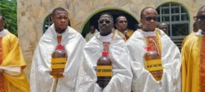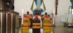 Mad. Comfort Selasi Alipui, a nurse at the Richard Novati Catholic Hospital at Sogakope, presented the Oil of the Sick. Ms. Victoria Mensah, a catechumen and a learner at the Alakple R. C. Basic School, presented the Oil of Catechumen, while Rev. Fr. Roger Govina (SC) of St. Rose of Lima quasi-parish, Atidzive, presented the Holy Chrism. Bishop Kumordji blessed the Oil of the Sick and Catechumens, and the priests joined him to consecrate the Holy Chrism.